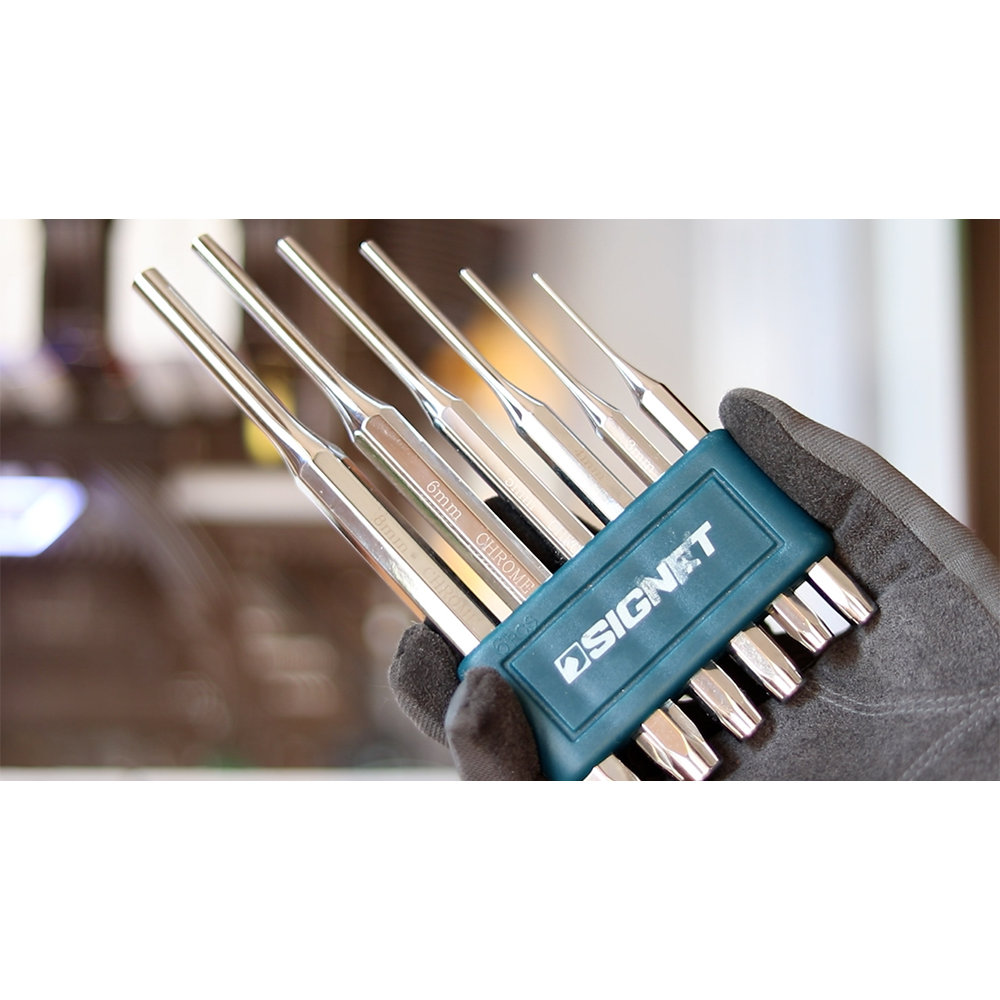 SIGNET 6pcピンポンチセットは高級感のあるミラーメッキ仕上げの平行ピンポンチの6本セットです。あらゆる種類のピンを挿入したり取り出したりする作業をサポートします。ホルダー付属。