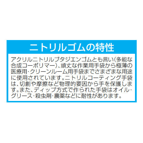 ●天然ゴムに比べ摩擦や突き刺し強度に優れ、油や洗剤等の扱いにも適しているニトリルゴム製です。