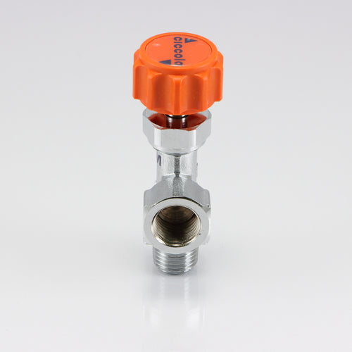 ●一次側がテーパー(PT)外ネジ、二次側がテーパー(PT)内ネジのタイプの、小型ニードルバルブです。