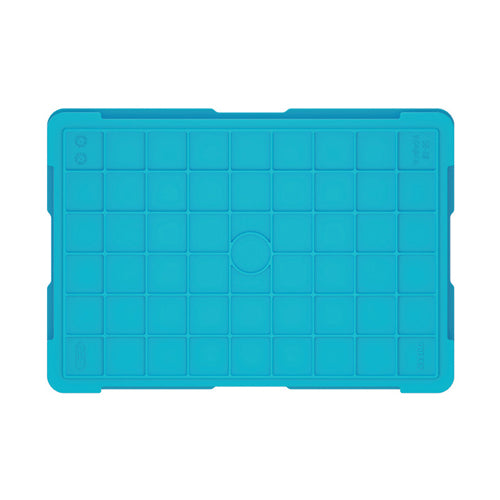 ●底面に格子状のリブ(平面部を補強するためその面に垂直に立てられた板形状)を設置しております。リブの高さによって曲げ強度は決まり、リブが高ければ高いほど、高い強度を示します。工業用コンテナに多く採用され、特に油を使う業界では膨潤(樹脂が油等を吸収して体積が増加する現象)による撓みを抑制する効果があります。