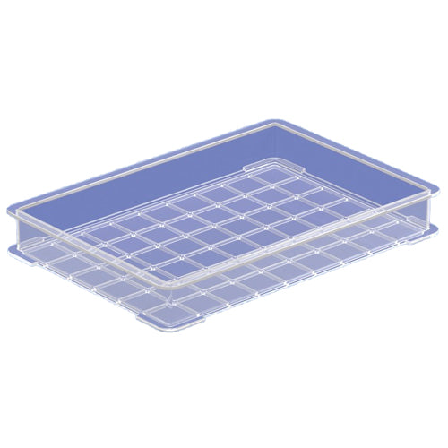 ●底面に格子状のリブ(平面部を補強するためその面に垂直に立てられた板形状)を設置しております。リブの高さによって曲げ強度は決まり、リブが高ければ高いほど、高い強度を示します。工業用コンテナに多く採用され、特に油を使う業界では膨潤(樹脂が油等を吸収して体積が増加する現象)による撓みを抑制する効果があります。