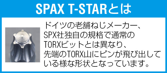 ●先端はTORX山にピンが飛び出している様な形になっています。これはドイツの老舗ネジメーカー、SPAX社独自の規格の為、通常のTORXビットとは異なりますのでご注意ください。
