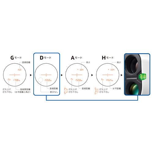 ●モード…Gモード(加減算距離&直線距離、打ち上げ打ち下ろし)、Dモード(直線距離)、Aモード(直線距離と高さ、打ち上げ打ち下ろし)、Hモード(水平距離と高さ、打ち上げ打ち下ろし)