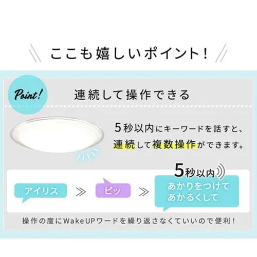 ●また、スマートスピーカーを介さない分反応が早く、「アイリス」というウェイクアップワードを発声した後5秒以内であれば、複数の操作が可能です。