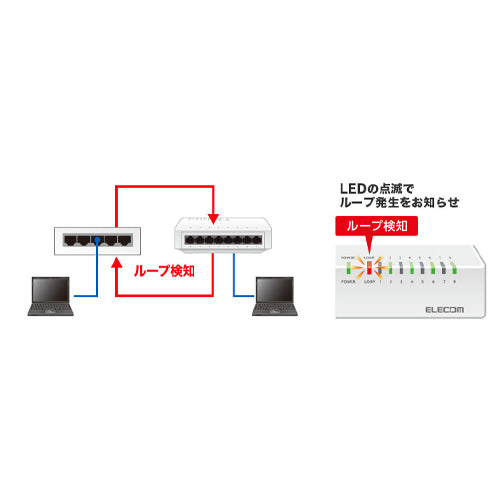 LEDランプの点滅によりネットワークループ発生をお知らせし、ネットワーク障害の解消を促します。