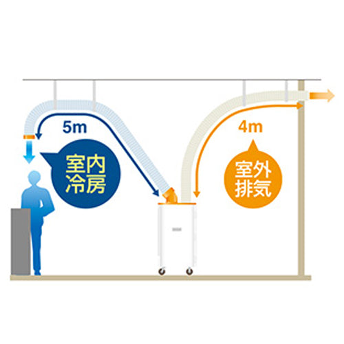 ●冷風ファン・排気ファンにシロッコファンを採用する事でダクトを延長し冷風を遠く離れた人へ運び、排気熱を室外に排気できます。