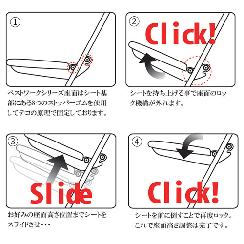 ●※製品の特性上、座面後部に偏って座ったり、使用中に揺らすなどなされると、座面が多少下がる事があります。その場合は再度お好みの高さを調整して下さい。